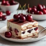 Cherry Amaretto Tiramisu is a delightful twist on the classic Italian dessert featuring layers of coffee and cherry juice soaked ladyfingers, creamy mascarpone cheese, and fresh cherries. This no-bake dessert perfectly balances the rich flavors of mascarpone with the tartness of cherries and a hint of almond from the amaretto-inspired cherry juice, making it an elegant treat for any occasion.