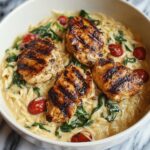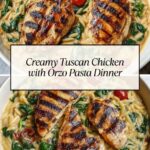 Creamy Tuscan Chicken with Orzo is a rich and flavorful dish featuring tender seared chicken breasts cooked in a luscious creamy sauce with sun-dried tomatoes, garlic, Parmesan cheese, and fresh spinach. Combined with perfectly cooked orzo pasta, this skillet meal offers a comforting Italian-inspired dinner that’s quick and easy to prepare, ideal for serving a family of four.