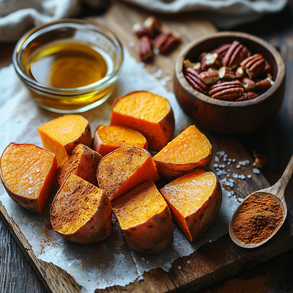 Once the sweet potatoes are tender and nicely caramelized, sprinkle chopped pecans on top. Lower the oven temperature to 375°F and return the potatoes to bake for 5-10 minutes or until the nuts toast lightly, adding a irresistible crunchy texture and nutty aroma.