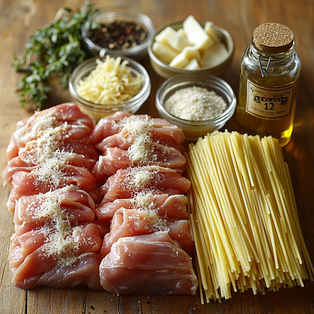 This indulgent chicken recipe features tender boneless, skinless chicken breasts smothered in a rich and creamy three-cheese Alfredo sauce. Served over perfectly cooked spaghetti noodles, the dish blends mozzarella, Parmesan, and cheddar cheeses with classic Italian seasonings for a comforting and flavorful meal perfect for weeknights or special occasions.