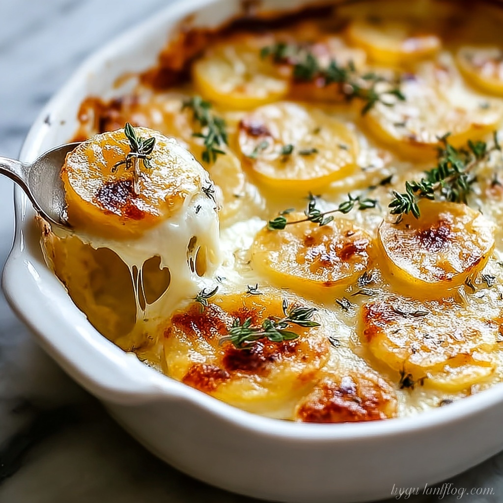 This indulgent rich potato gratin is a classic comfort food perfect for cozy family dinners. Layers of tender starchy potatoes are baked in a creamy, cheesy sauce infused with fresh thyme, garlic, and nutmeg, topped with a golden, crispy cheese crust. It’s a comforting side dish that pairs beautifully with roasted meats or vegetarian mains.