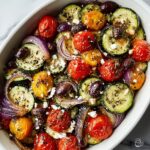 A vibrant and healthy one-pan Greek vegetable recipe featuring a colorful mix of bell peppers, zucchini, red onion, cherry tomatoes, and Kalamata olives, seasoned with olive oil, oregano, and garlic powder then oven-roasted to perfection. This easy-to-make dish is perfect as a side or a light main and captures the fresh flavors of Mediterranean cuisine.