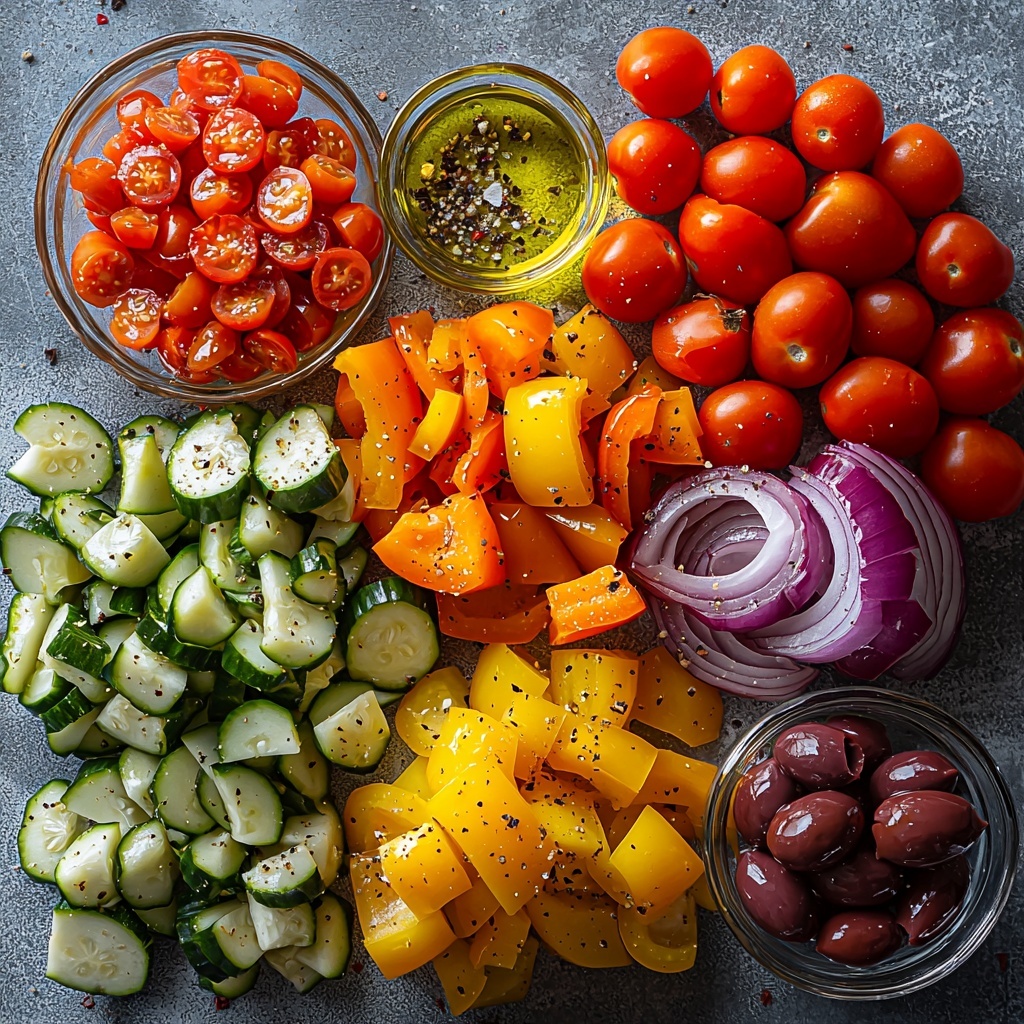 This recipe keeps things delightfully simple, focusing on fresh vegetables and a handful of staple seasonings that really bring out every note of flavor. Each ingredient plays a vital role: the bell peppers add sweetness and crunch, zucchini brings a subtle earthiness, red onions offer a slight sharpness, while cherry tomatoes burst with juiciness, and Kalamata olives introduce that perfect salty tang.