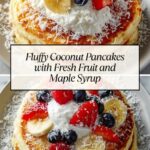 Deliciously fluffy Sweet Coconut Cream Pancakes made with coconut milk and shredded coconut, perfect for a tropical-inspired breakfast topped with fresh fruits, whipped cream, and maple syrup.